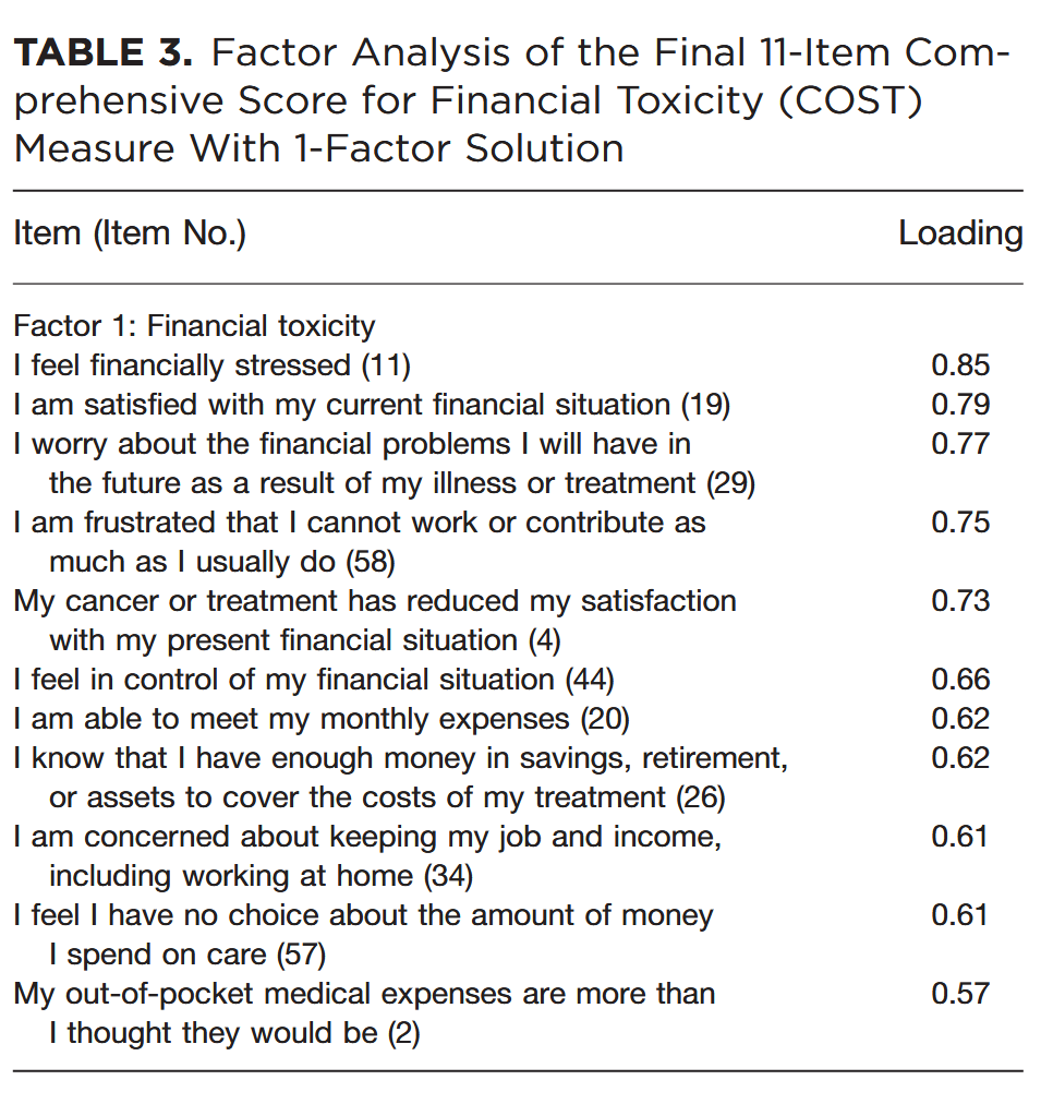 - Created by @desouza2014 and validated for US cancer patients; the construct originally formed a single factor (on finances, resources, affects, coping and effects on family)
