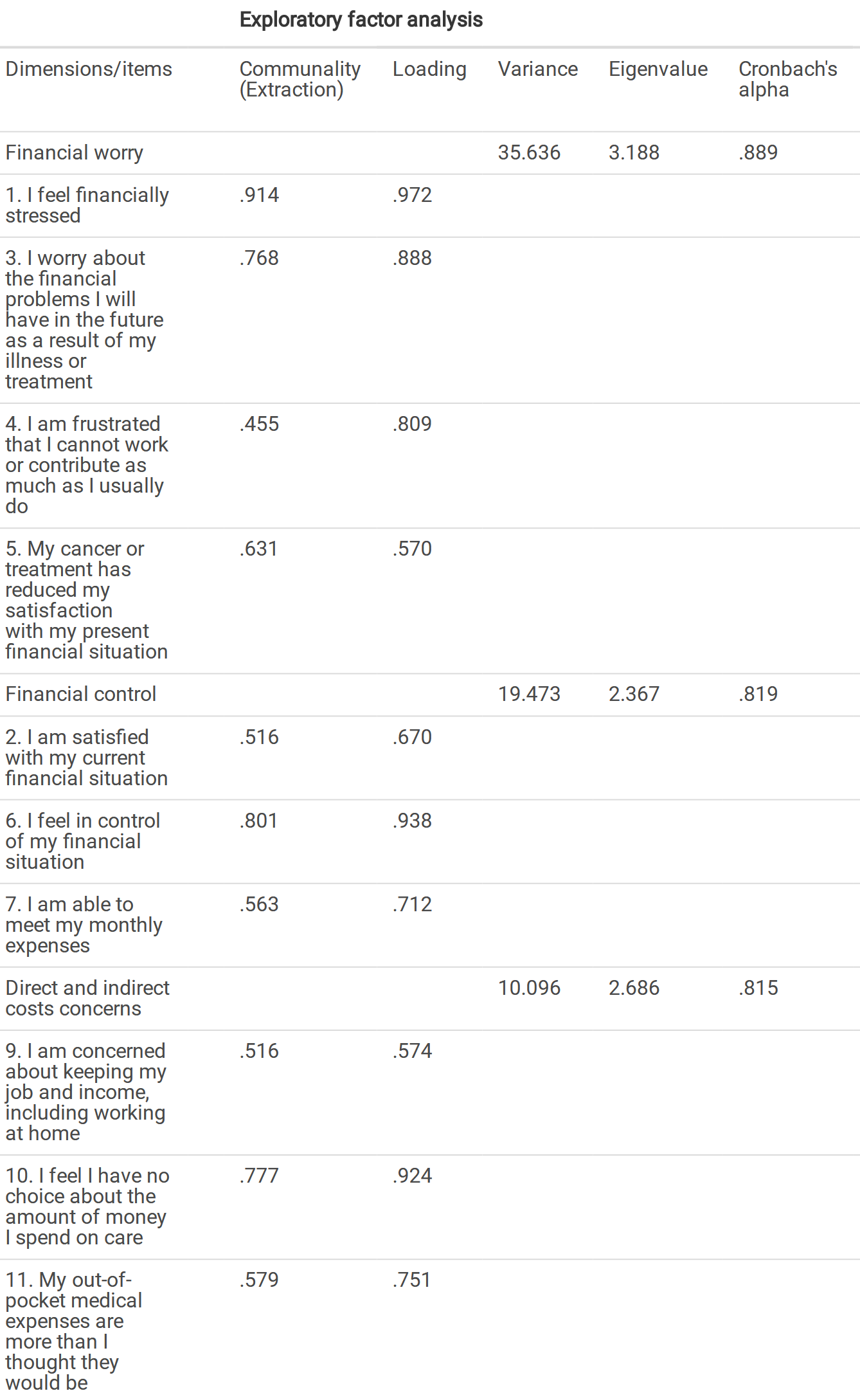 - Validated by @sharif2020 for Persian cancer patients; the construct changed to three dimensions (financial worry, financial control and direct-indirect costs concerns) and had 11 items: