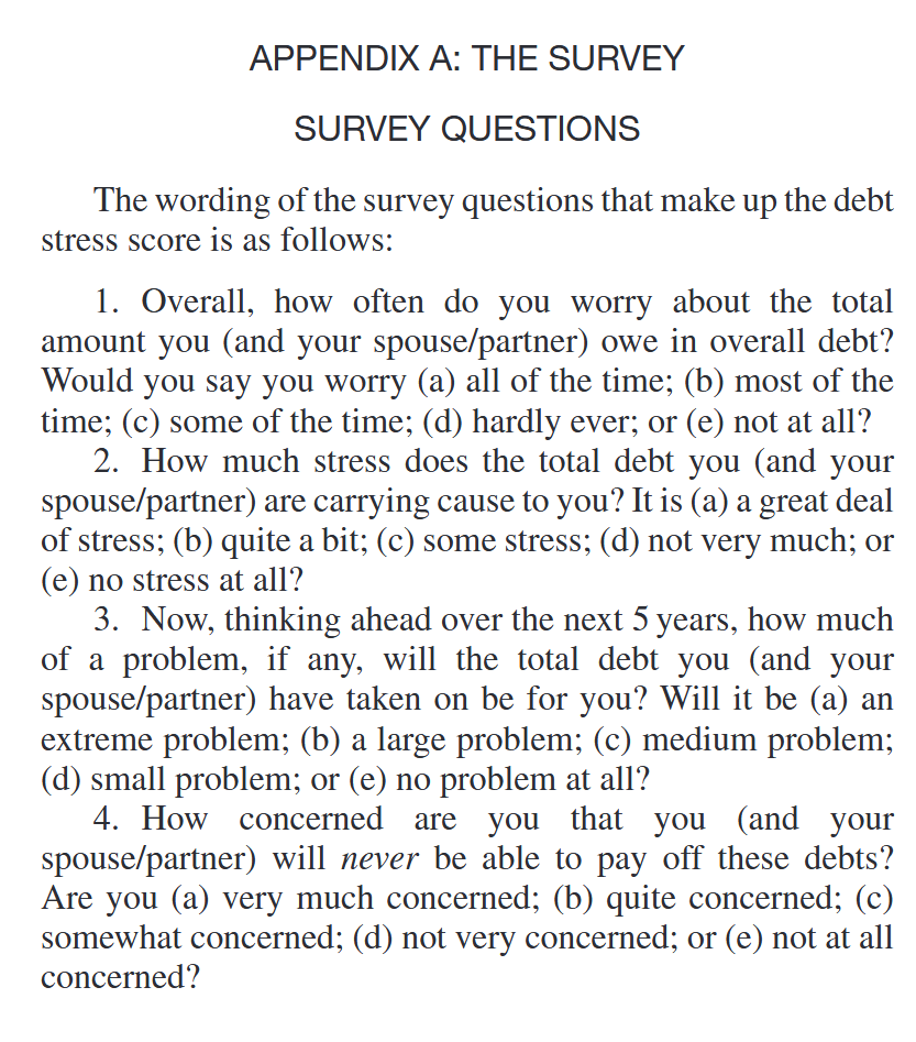 - It represents a unidimensional construct to quantify self-reported aspects of stress as they were directly tied to the respondent’s debt: