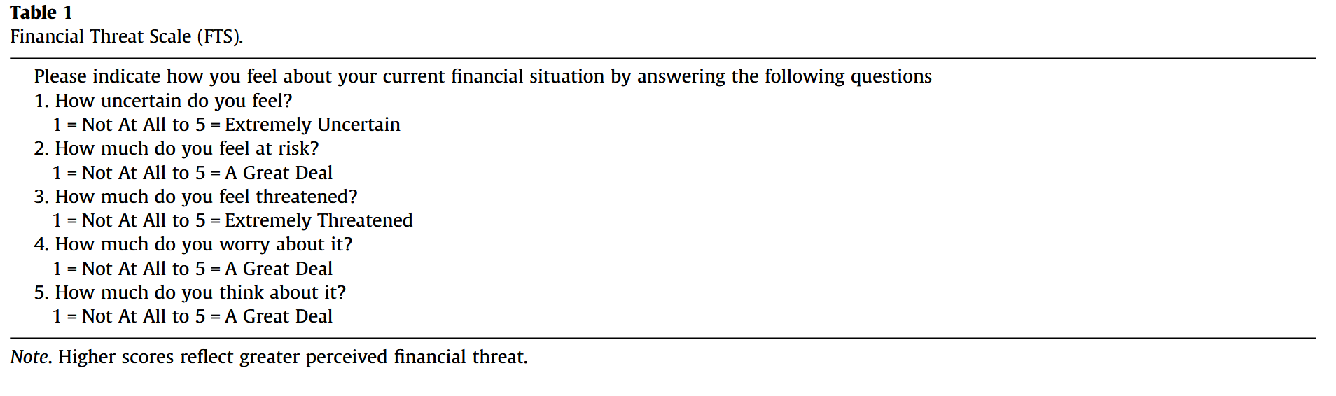 - It has 5 items that address uncertainty, risk, perceived threat, financial preoccupation with one’s personal finances
